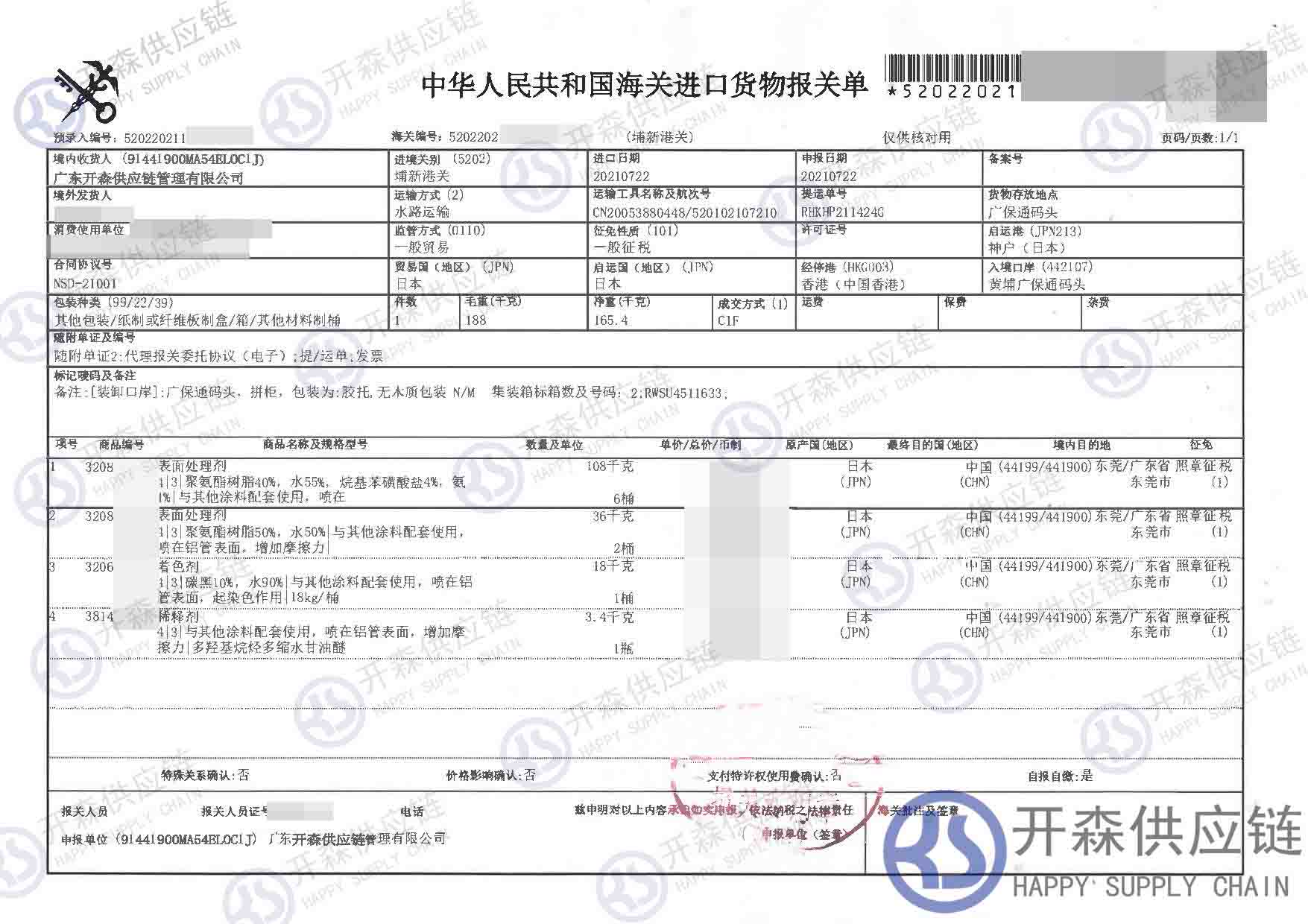 【導讀】您正在閱讀的是關于【進口案例】表面處理劑進口報關代理服務的內容,本文由開森化工品進口報關代理小編整理編寫;