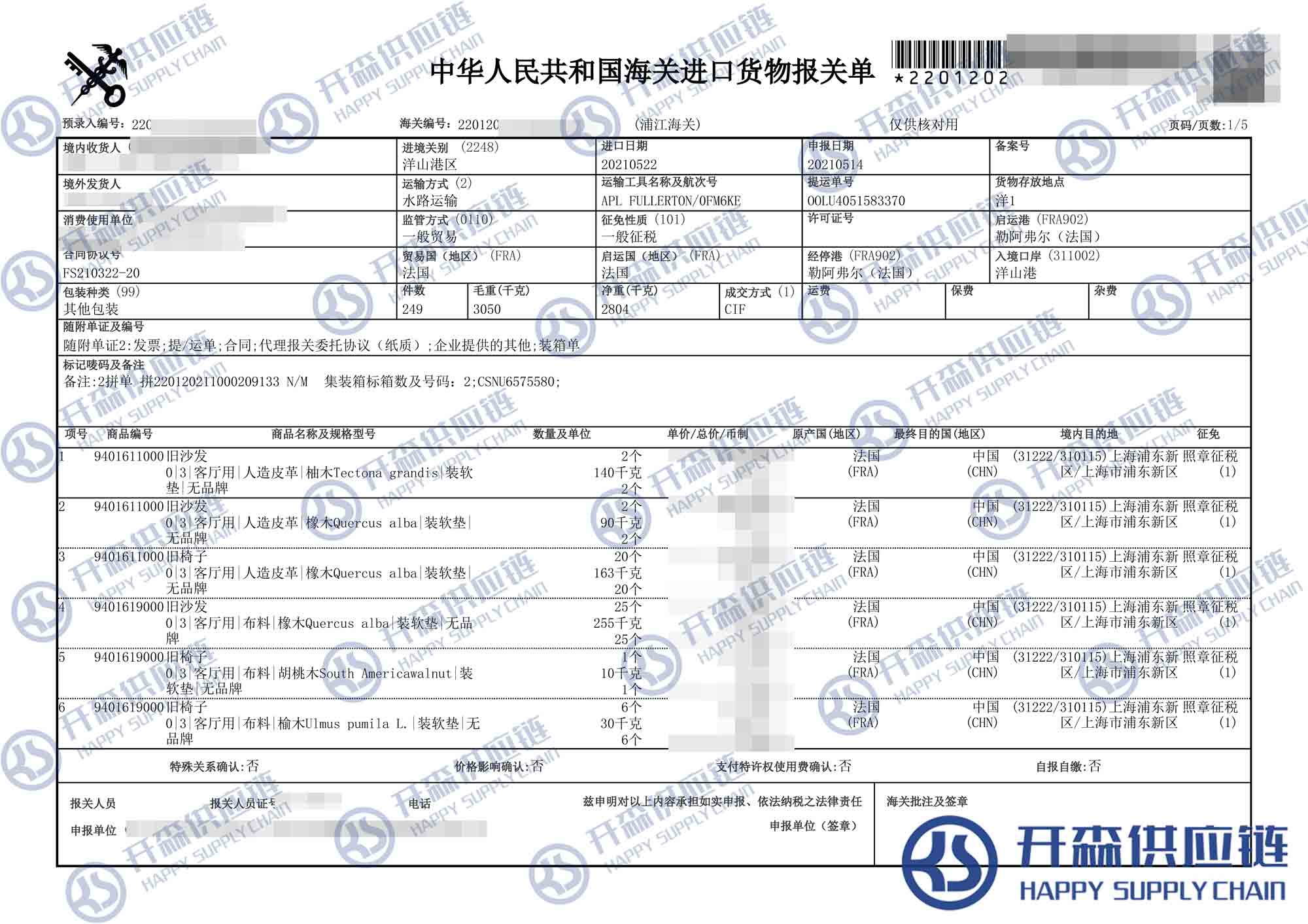 【導讀】您正在閱讀的是關于法國舊沙發(fā)家具進口報關代理服務【清關案例】的內容,本文由開森二手家具進口報關代理小編整理編寫;