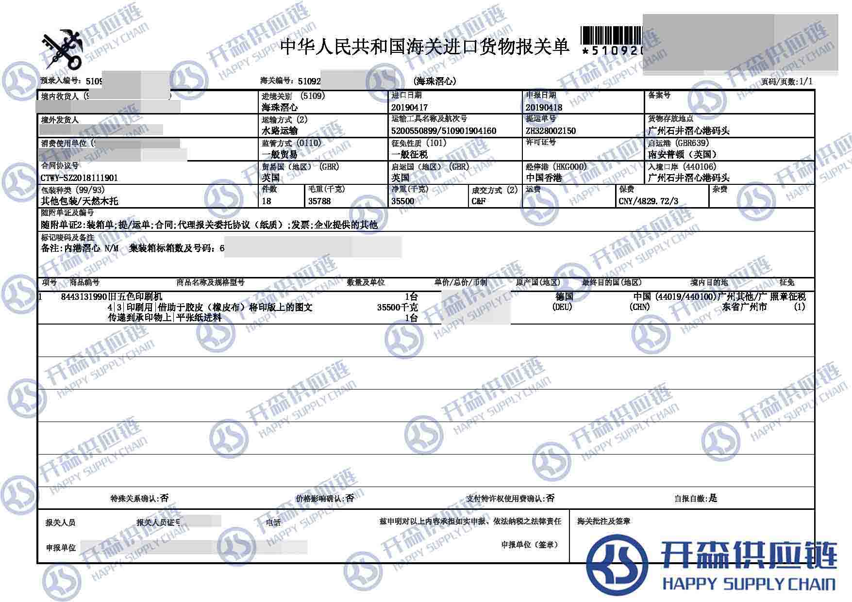 開森進口供應鏈擁有豐富的二手舊印刷機進口報關操作經驗及案例,十余年操作經驗及案例可供參考,可按需定制進口方案,幫助客戶解決進口難題,快速進口清關到港到貨。