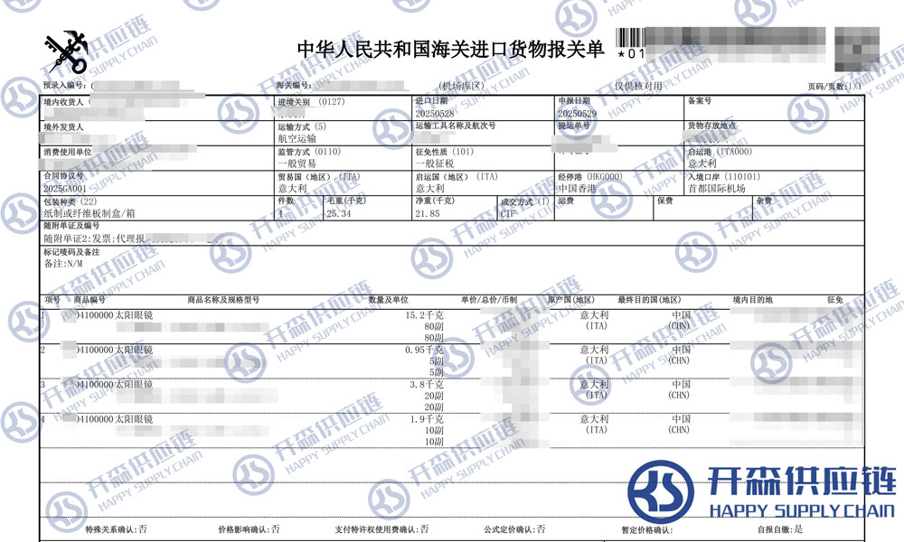 上述就是北京機場太陽眼鏡進(jìn)口報關(guān)代理服務(wù)【清關(guān)案例】的全部內(nèi)容,希望能對您有所幫助,如有進(jìn)口報關(guān),進(jìn)口報關(guān)代理公司,進(jìn)口報關(guān)代理上任何疑問及問題可隨時在線聯(lián)系我們或撥打 18002611553,開森供應(yīng)鏈擁有豐富的進(jìn)口報關(guān),進(jìn)口報關(guān)代理公司,進(jìn)口報關(guān)代理操作經(jīng)驗及案例,10余年進(jìn)口經(jīng)驗為您所用,各類進(jìn)口疑難都能為您一一解答及協(xié)助快速處理解決!
