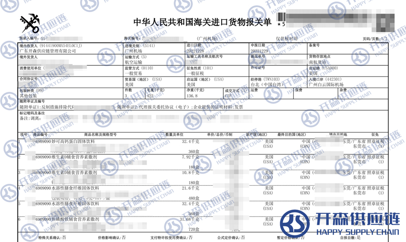 【導讀】您正在閱讀的是關于廣州機場美國固體飲料進口報關清關代理服務【經典案例】的內容,本文由開森固體飲料進口報關代理小編整理編寫;