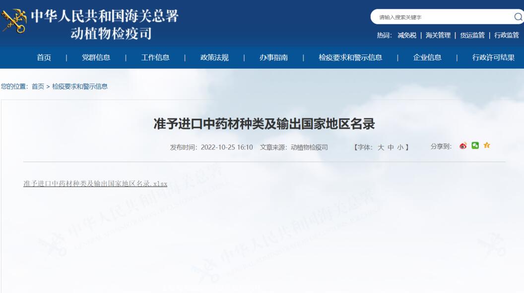 海關總署對進境中藥材實施檢疫準入制度,包括產品風險分析、監管體系評估與審查、確定檢疫要求、境外生產企業注冊登記以及進境檢疫等。目前,我國已準予91個國家、地區的上百種中藥材,企業可在海關總署—動植物檢疫司—檢疫要求和警示信息(http://dzs.customs.gov.cn/dzs/2746776/4445554/index.html)查詢準予進口中藥材種類及輸出國家地區名錄信息(也可咨詢開森供應鏈,我們將為您提供最新詳細名單目錄)