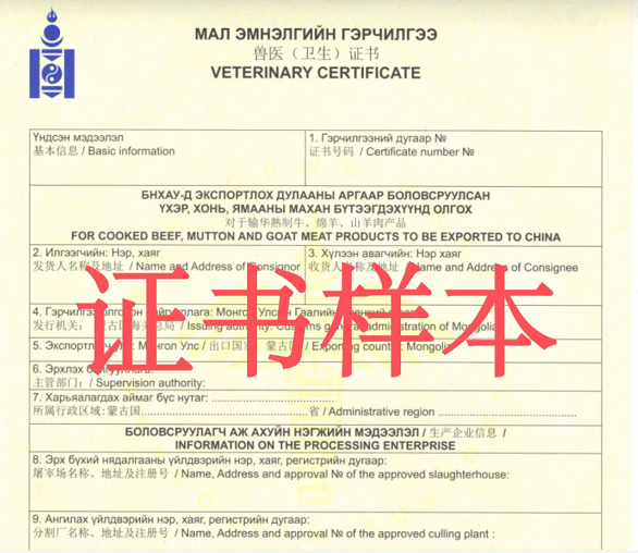 蒙古國官方已向中國海關總署備案確認蒙古國熟制牛羊肉產品獸醫(yī)衛(wèi)生證書樣式、官方印章及官方獸醫(yī)簽字等相關信息。進口蒙古國熟制牛羊肉產品應附有蒙古國官方出具的獸醫(yī)衛(wèi)生證書,并加蓋官方印章和官方獸醫(yī)簽字,同時向中國海關推送對應蒙古國輸華肉類衛(wèi)生證書電子信息。